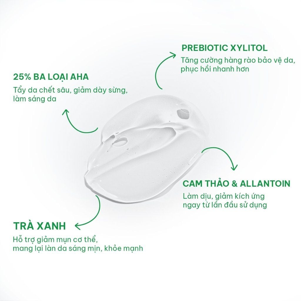 - Peel Glowy với 3 loại AHA (Glycolic, Lactic, Mandelic Acid) giúp loại bỏ tế bào chết, thông thoáng lỗ chân lông và làm sáng da, đồng thời chiết xuất cam thảo, trà xanh và Xylitol dịu nhẹ, giúp giảm thâm và cải thiện kết cấu da từ lần đầu sử dụng.