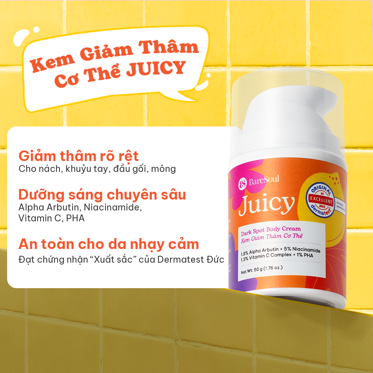 - Juicy là kem dưỡng chuyên sâu với Alpha Arbutin, Niacinamide, Vitamin C và PHA giúp dưỡng sáng, đều màu, làm mờ vết thâm vùng nhạy cảm như nách, khuỷu tay, đầu gối hay mông, đồng thời nuôi dưỡng da mềm mịn và khỏe mạnh.
